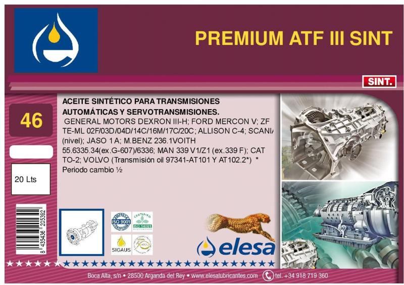 Aceite Sintético para transmisiones automáticas y servotransmisiones. Especial para aquellas aplicaciones donde el constructor recomienda un fluido tipo PREMIUM ATF III-SINT de acuerdo a las nuevas exigencias de los constructores de vehículos y transmisiones europeos. Reemplaza a los fluidos correspondientes a la antigua especificación General Motors ATS, Type A y Dexron B. Sistemas hidrostáticos de equipos móviles de alto rendimiento que requieren un fluido de viscosidad ISO-46 de alta calidad y baja fricción.